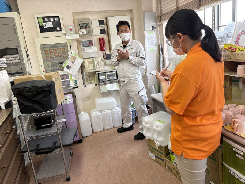 消火器の使い方を指導していただき、各施設の通報装置の取り扱いについても学びました。 |